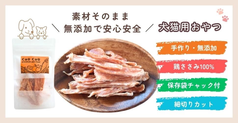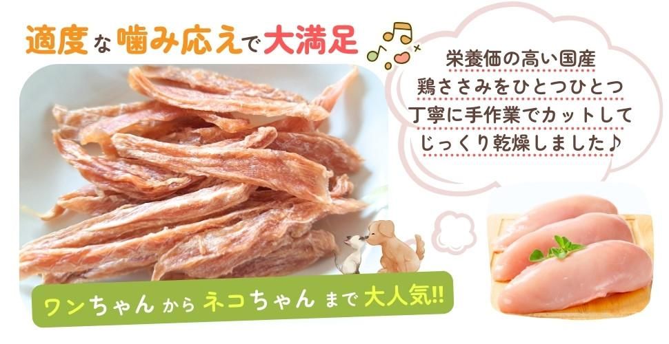 高品質の国産・鶏ささみ100%で食い付きも抜群です。食欲をそそる旨味たっぷりの栄養価の高い鶏ささみをひとつひとつ丁寧に手作業でカットしてじっくり乾燥しました♪適度な噛み応えで、ワンちゃんもネコちゃんも大満足(^^♪