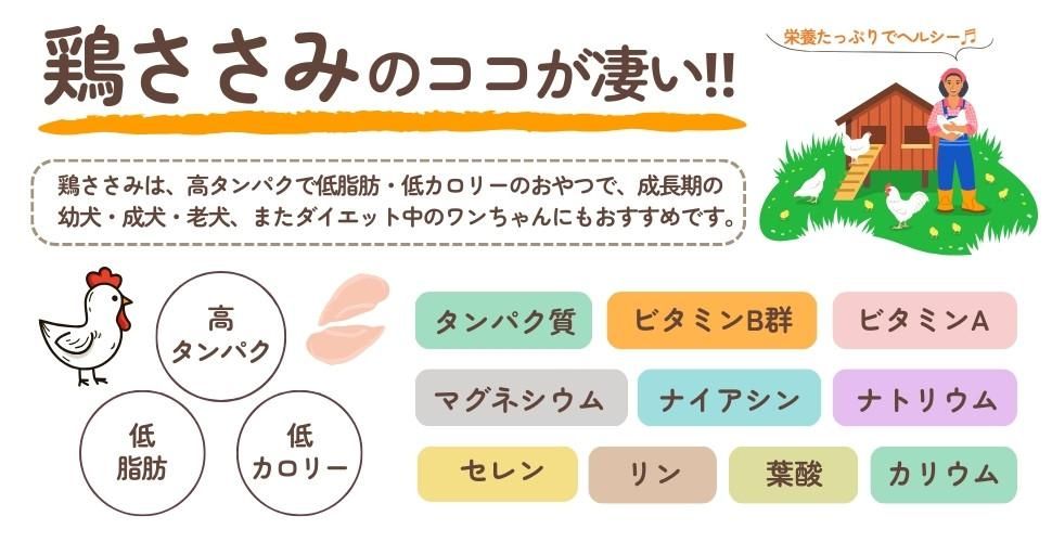 高タンパク・低脂肪・低カロリーの鶏ささみには、健康を維持するうえで必要な動物性たんぱく質を豊富に含んでいます。犬の筋肉作りや皮膚の健康に役立つたんぱく質や、糖質や脂質の代謝を促進してくれるビタミンB群も多く含んでいます。また、脂質の含有量も少なく低カロリーなので肥満防止にも役立つ為、体重が気になるワンちゃんにもおすすめです。